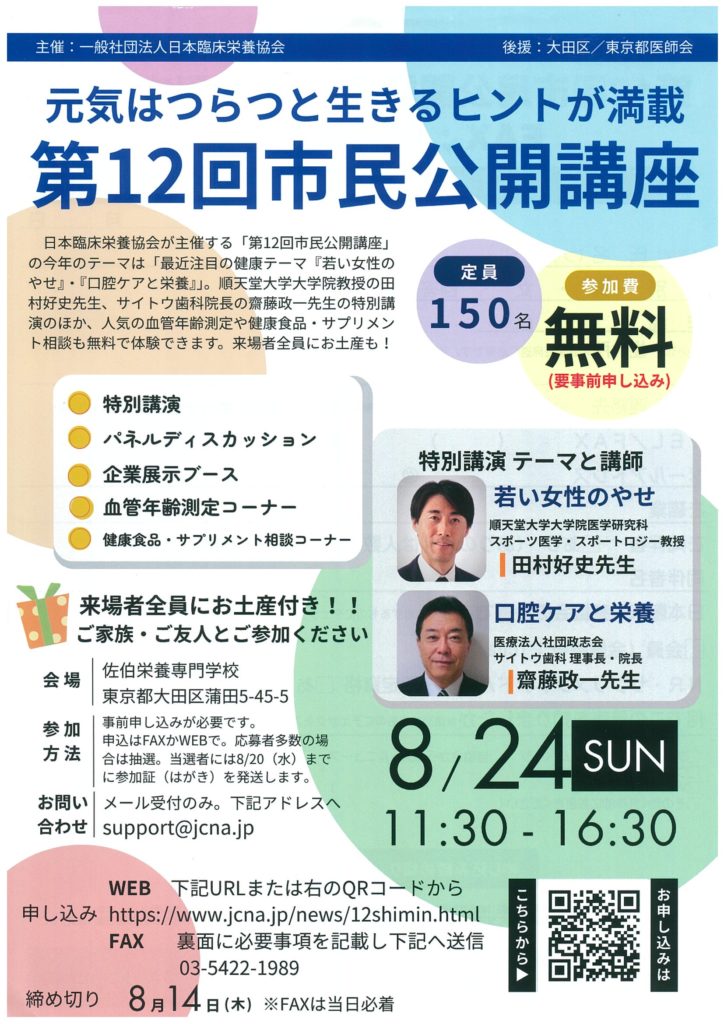 第12回市民公開講座(大田区・東京都医師会後援) 2025年8月6日 8月24日(日曜日)、一般社団法人日本臨床栄養協会が「第12回市民公開講座」(後援:大田区、東京都医師会)を開く。定員150名で参加費は無料。会場は佐伯栄養専門学校(大田区蒲田5-45-5)。時間は11時30分~16時30分まで。 特別講演:若い女性のやせ・田村好史先生(順天堂大学教授) 特別講演:口腔ケアと栄養・齋藤政一先生(医療法人社団政志会)